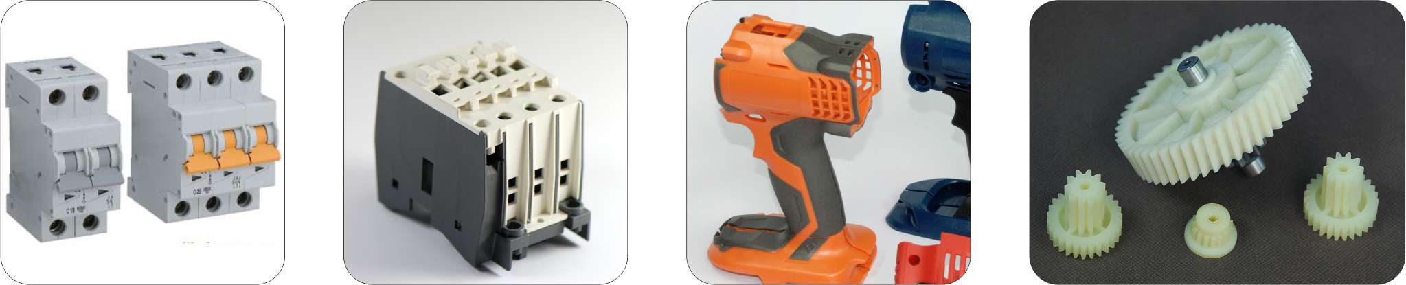 工业/电气:电动工具、齿轮、线圈骨架、马达支架、传动零部件、轴承保持架、热水测量仪表、温水泵泵体、叶轮、渔具、电子电器接插件开关、连接器等。钟表壳体、复印机及照相机等零件、渔具、电子电器接插件开关、连接器等。
